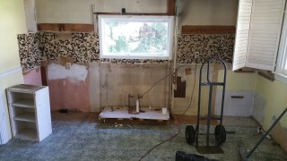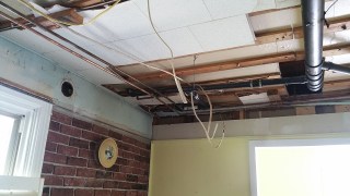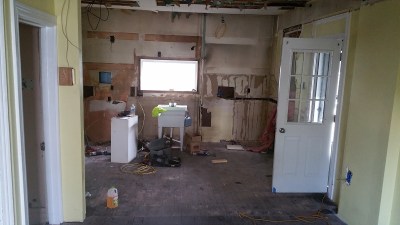 • Kitchen demo. The team removed the stove, sink, 8 feet of cabinets (upper and lower), and a drop ceiling. Yes, there was a drop ceiling in the kitchen. This is going to be a great improvement drywalling the ceiling and cleaning up the electrical mess that was left behind. The new kitchen will include a dishwasher and some additional counter space. The plan is to close up the window to the far right to make more room for cabinets and countertop space. We had discussed adding an island for additional storage, but due to the placement of the doors, it would impede the flow of the room.