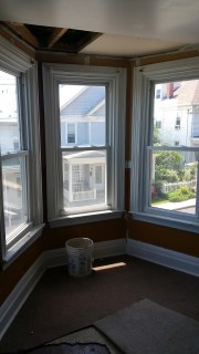 • The master bedroom. This large bedroom has the window bump out like the front room on the first floor. The demo for the master is not yet complete in these photos. The closet is being enlarged to be a walk-in and a door to the bathroom is being added to create an ensuite.