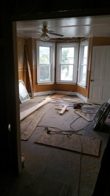 • There are two additional rooms on the first floor that needed some minor demo. The hardwood floors are going to be refinished where possible. Upon demo, it was discovered that laminate flooring was glued to the hardwood in one of the rooms. Depending on how removal goes, this room may end up having to be carpeted. Fortunately, the room with the bump out on the first floor has wood flooring that is in pretty good shape and they will refinish nicely. This room would make a perfect office! The radiators, that were previously in each room throughout the house, have all been removed.